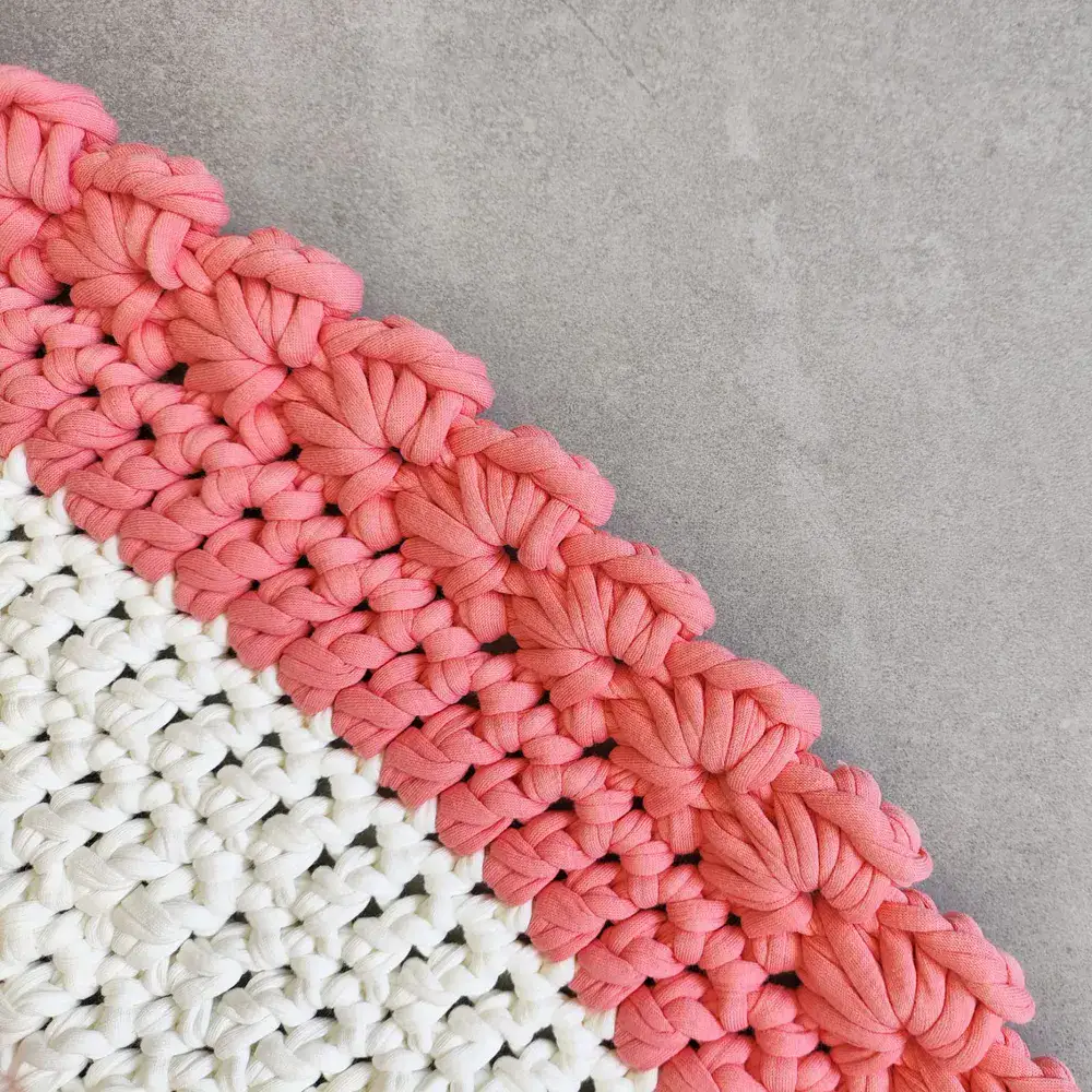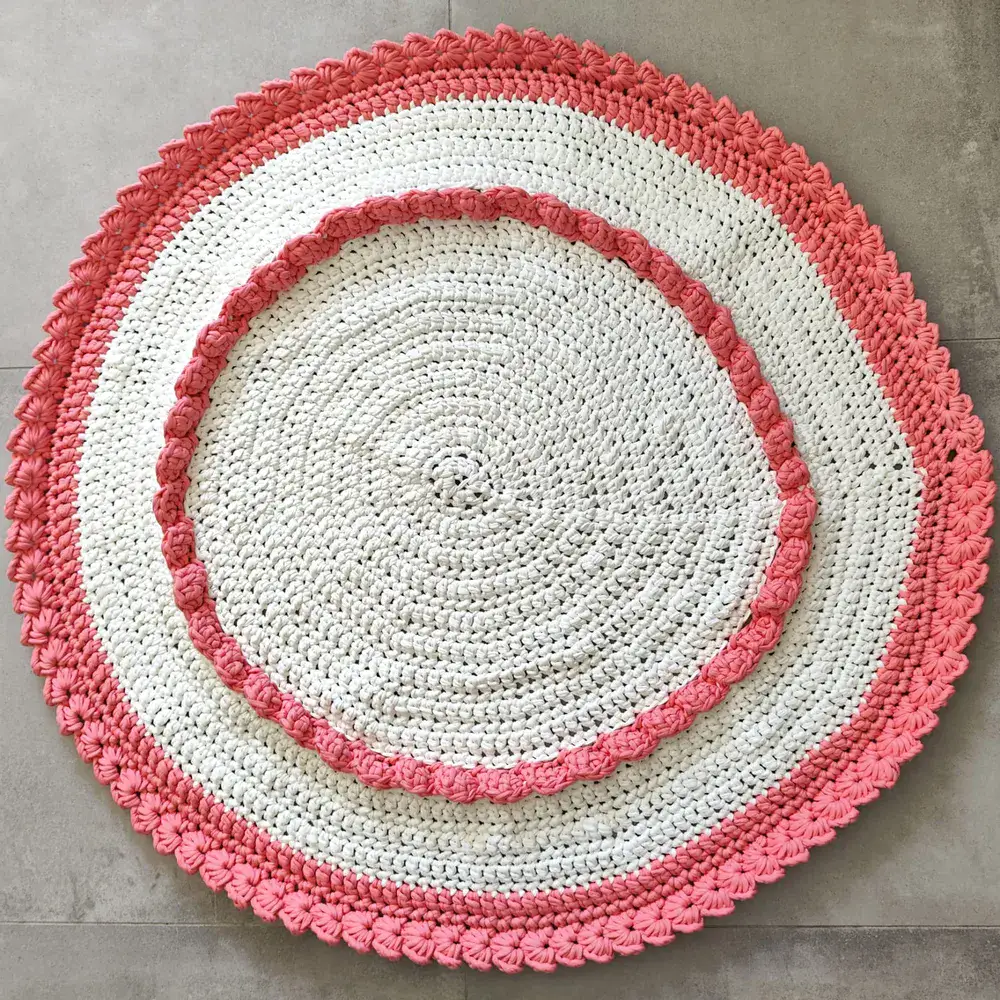 שטיח עגול בצבע לבן עם עיטורים ורודים